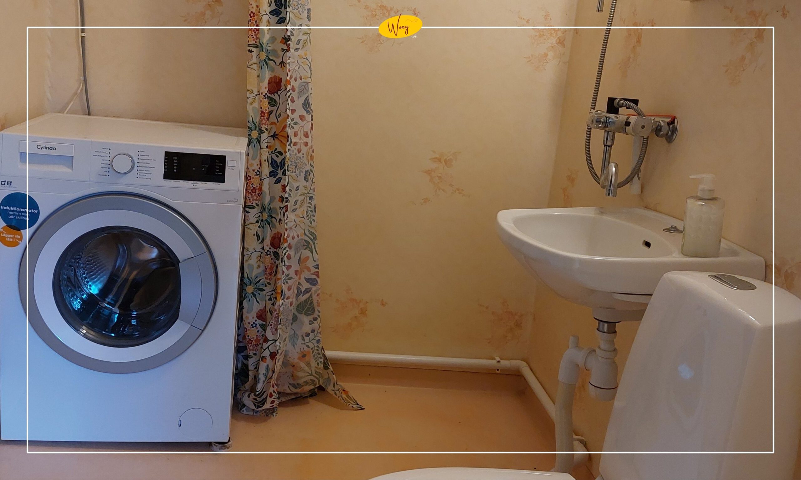 De praktische badkamer heeft een douche, een toilet en een wasmachine.